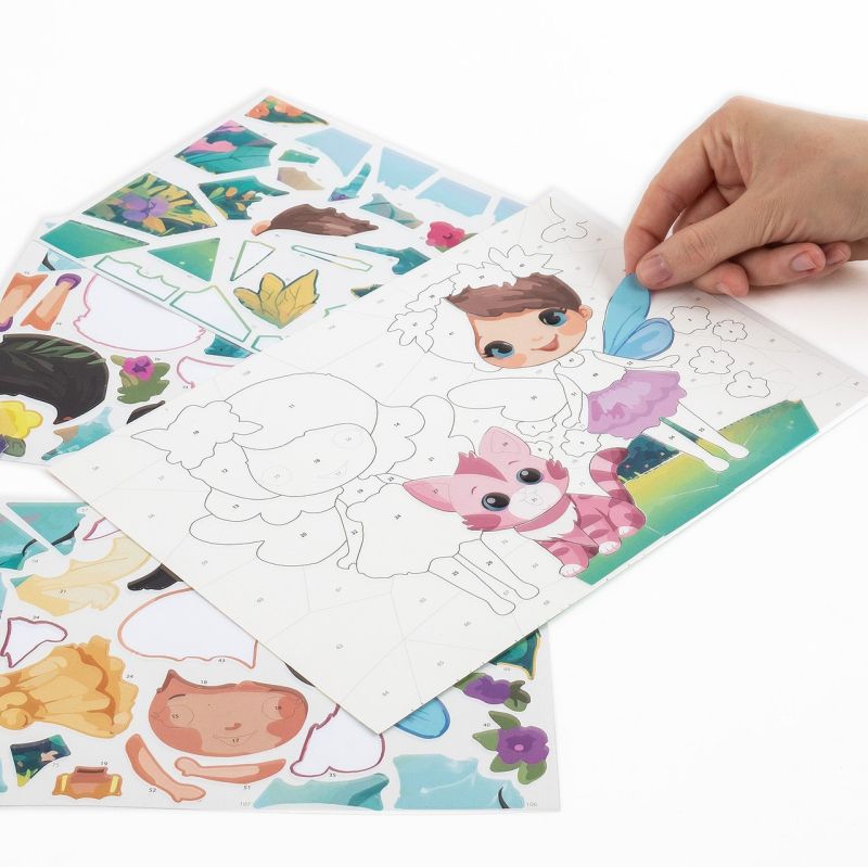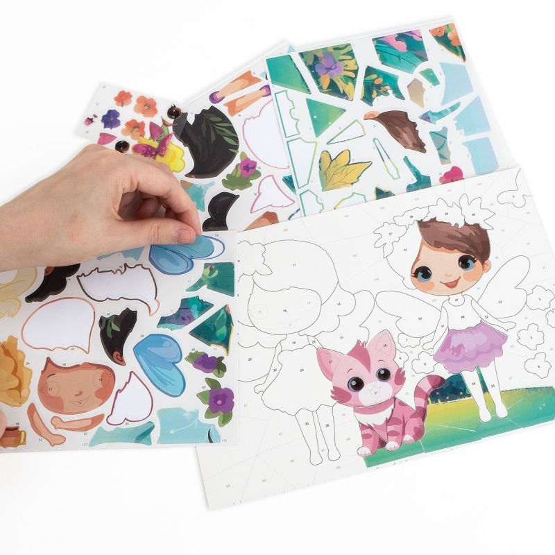 Създайте красиви картини без бои или четки. Това е занимание с рисуване по номера. Картината има номерирани места, които са запълнени с подходящи стикери от включените листове. Всеки номер показва кой стикер къде да залепите, което прави играта проста и интуитивна. Това занимание с колаж развива концентрация и прецизност, като същевременно гарантира чисти ръце и липса на цапане. Основната тема е приказен еднорог в магическа обстановка. Получената картина може да се залепи върху картон и е готова за окачване или подаряване.