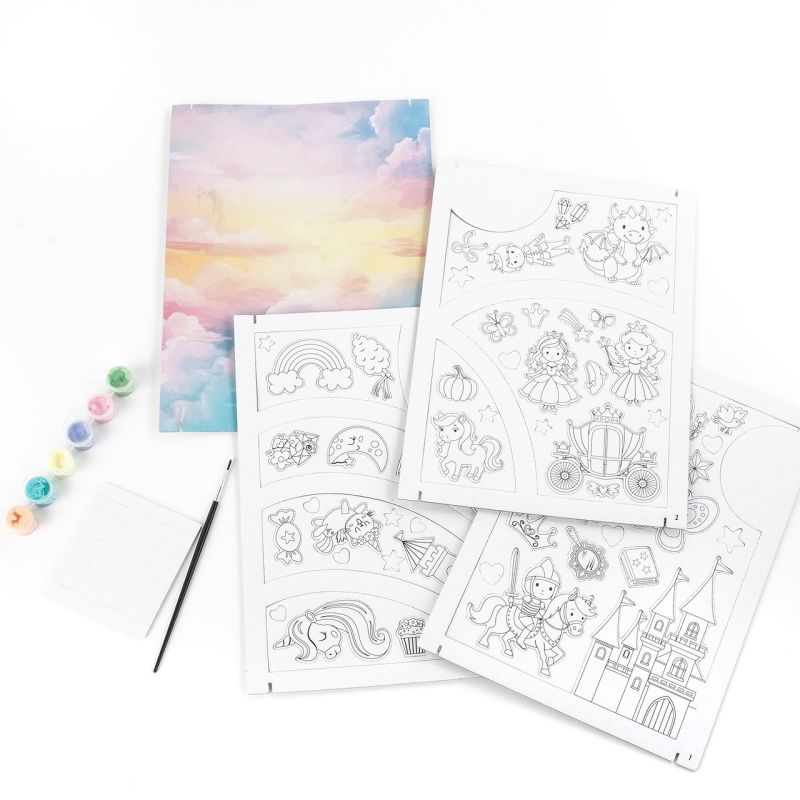 Създайте магическа триизмерна картина в магическа атмосфера с този пълен комплект, който включва 4 дъски, 6 бои с четки, 70 3D картонени елемента и 65 самозалепващи се квадрата. Следвайте инструкциите на гърба на опаковката – първо боядисайте дъските, след това сглобете рамковите елементи и накрая залепете 3D елементите. Резултатът ще бъде уникална композиция, която ще ви зарадва със своя триизмерен характер.