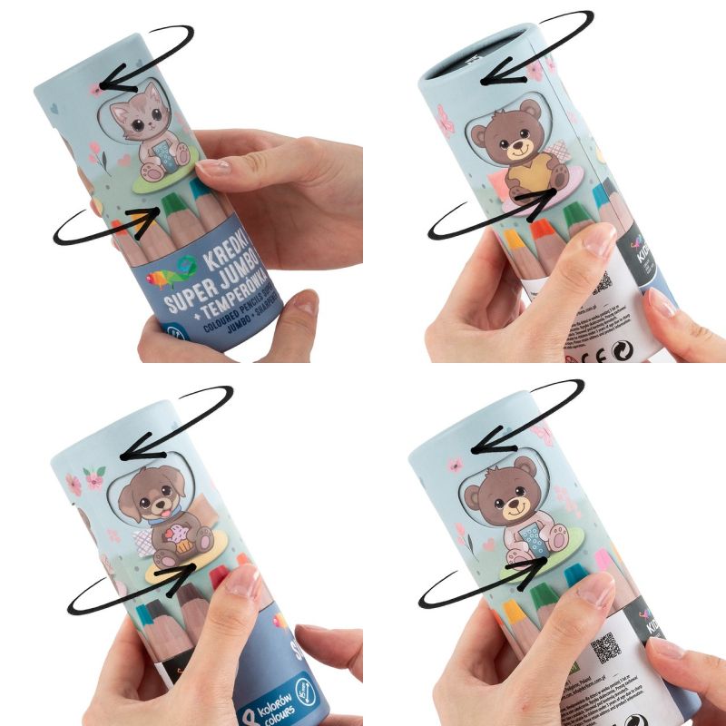 Супер големи моливи с острилка. Идеални за малки художници, които се учат да пишат и оцветяват. Диаметърът им от 1,5 см осигурява удобен и стабилен захват за децата. Моливите не са заострени, което ги прави особено безопасни дори за най-малките. Поместени са в кутия която може да се завърта и сменя, за да съответстват главите на телата, показани на опаковката. Вътре ще намерите осем цвята моливи, идеално оразмерени за малки ръчички, и острилка. Това е отличен избор за деца, които започват своето рисувателно приключение, подпомагайки развитието на фината моторика и насърчавайки творческото изразяване.
