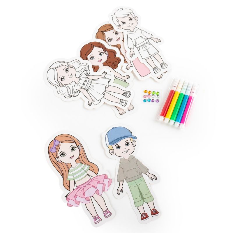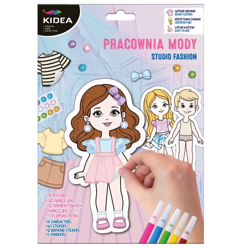 Увлекателно модно студио за малки дизайнери – безкрайни възможности за творческа игра с мода и стил. Пакетът включва 15 герои за декориране, 60 стикера за дрехи, 12 диаманта и 5 маркера.