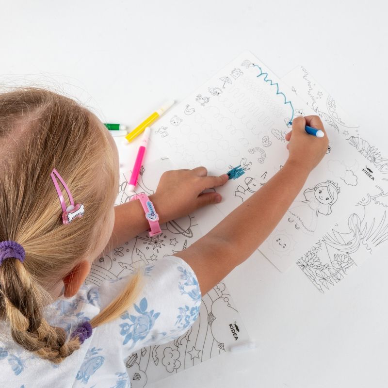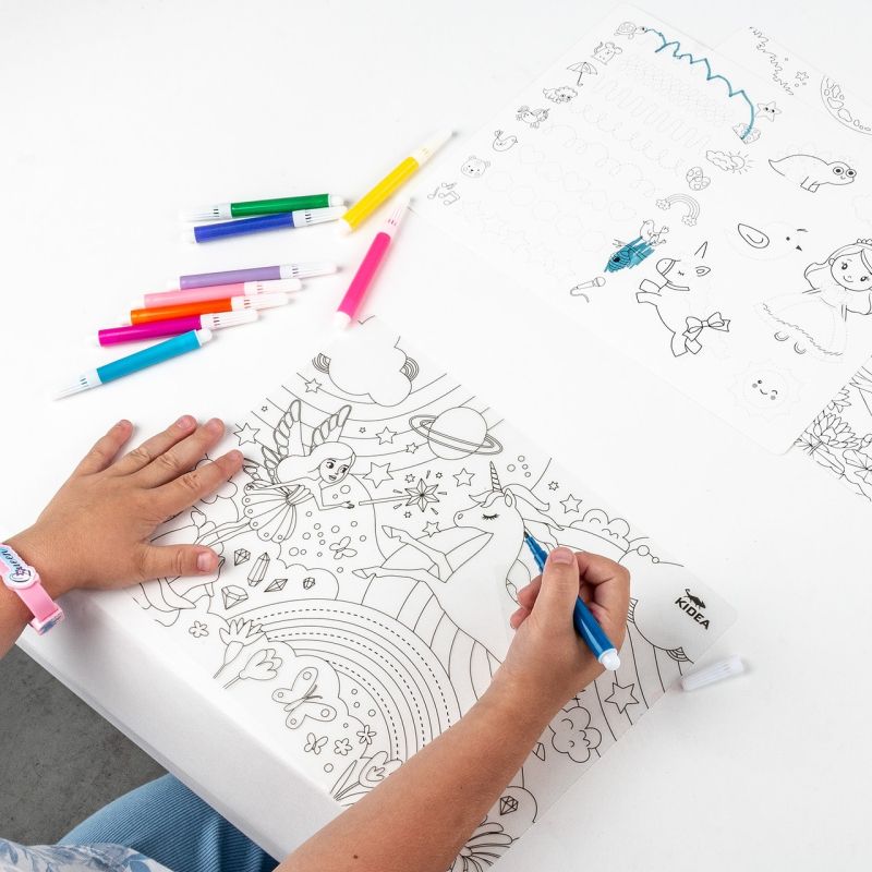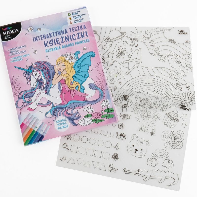 Тази папка съдържа шест тебеширени маркера в удобен калъф и разнообразие от креативни повърхности. Три изтриваеми дъски и четири хартиени карти предлагат широк набор от възможности: празна дъска за свободно рисуване, шаблони с модели и рисунки за учене на писане и упражняване на фината моторика, както и готови мотиви за оцветяване. Папката се закопчава с велкро, за да държи всички елементи на мястото си. Идеална за пътуване и като алтернатива на традиционните канцеларски материали.