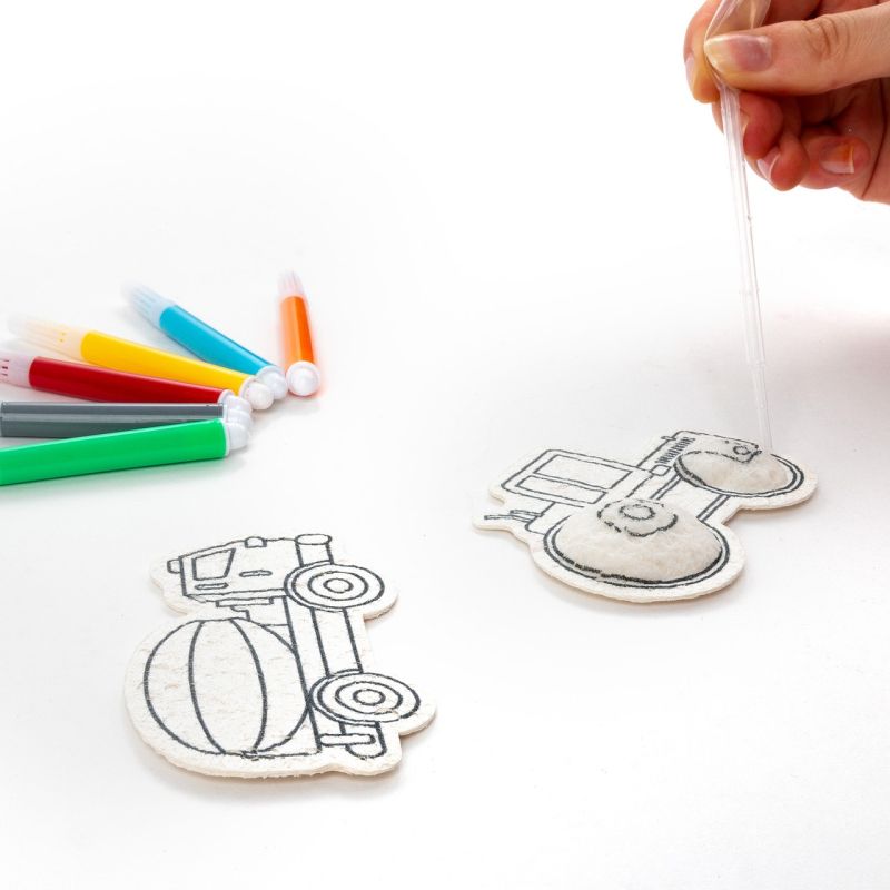 Магически карти, активирани с вода. Комплектът включва три магически карти във формата на превозни средства, пипета за прецизно дозиране на вода и шест цветни маркера. Просто нанесете капки вода върху желаните зони и материалът започва да набъбва, създавайки 3D ефект. Тази комбинация от наука и изкуство ще плени всяко дете.