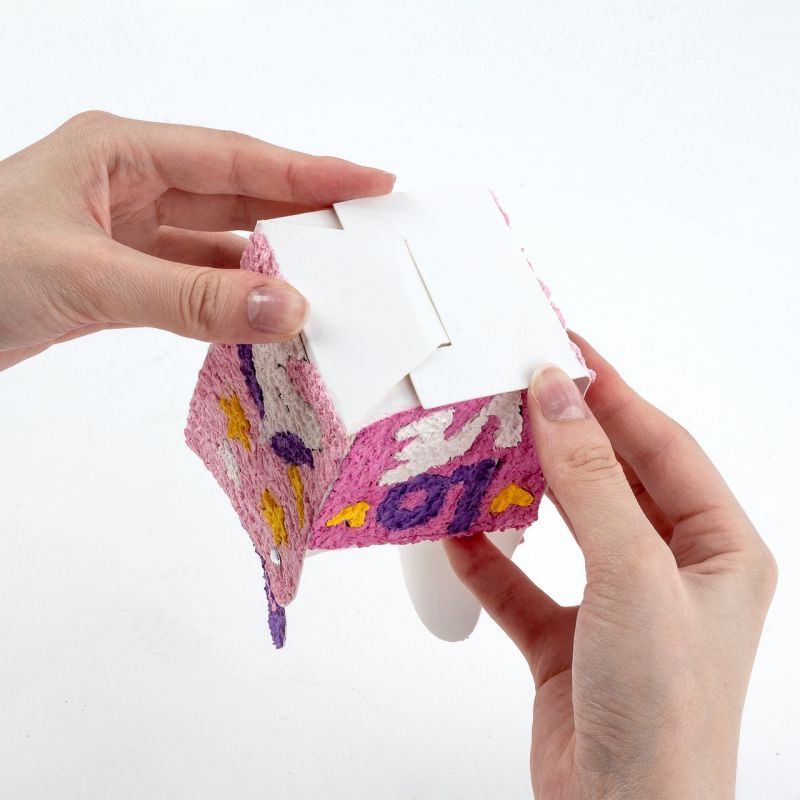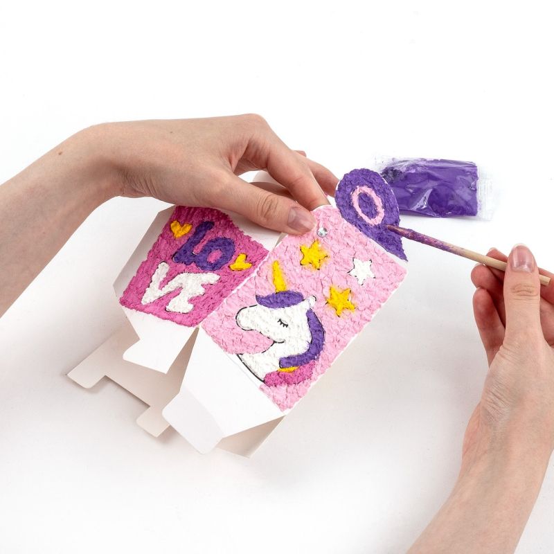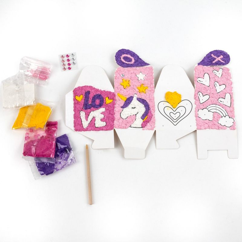 Комплектът включва: кутия, 5 цвята хартиена пулпа: розово, лилаво, бяло, жълто и тъмно розово, стилус за нанасяне на пулпата и 12 диамантени стикера.