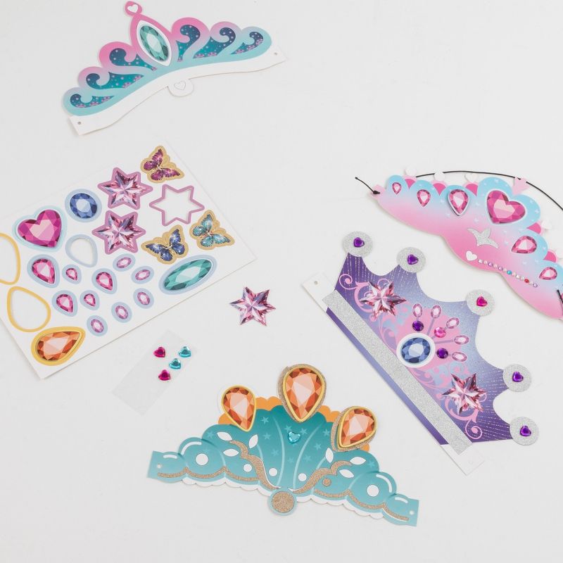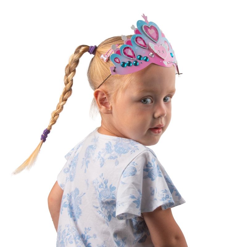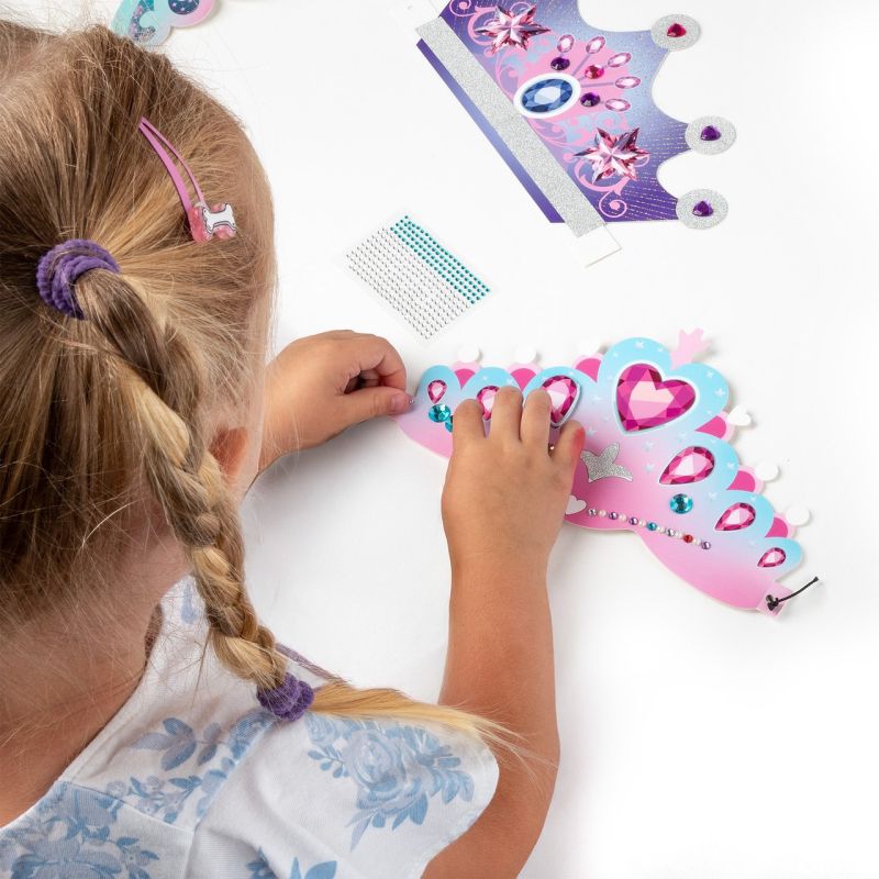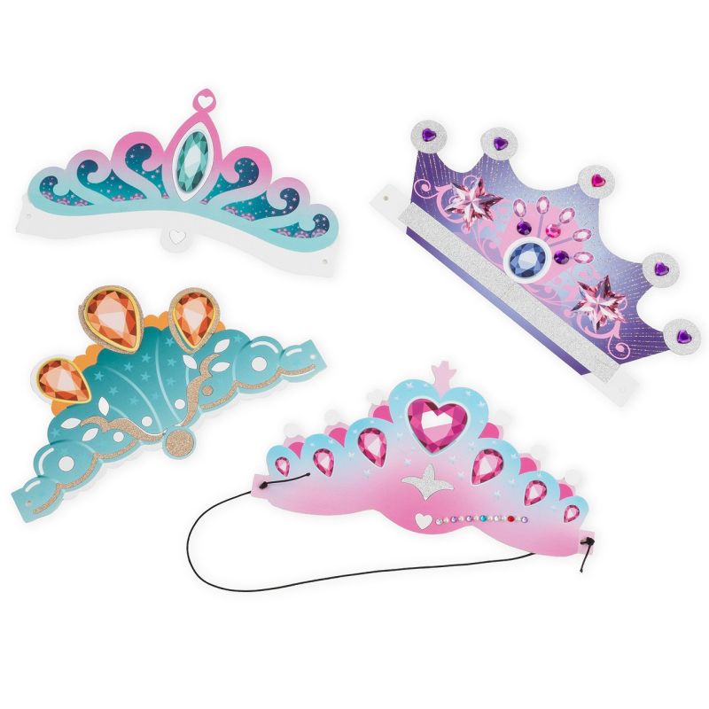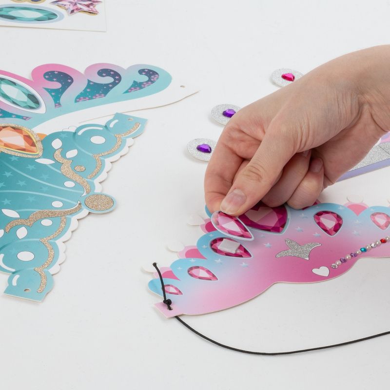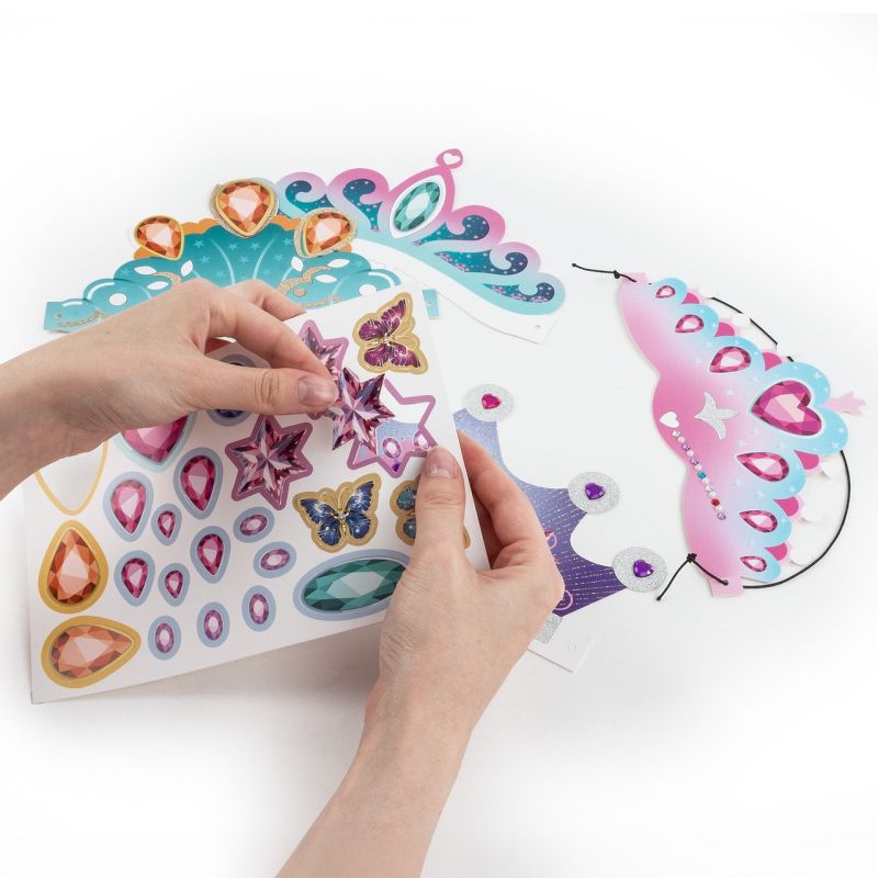 Сбъднете мечтата си за принцеса с тези декорации за корони! Този комплект включва красиви корони, които можете да украсите с брокатена хартия, стикери и блестящи диаманти. Създайте уникални, персонализирани корони – идеални за рождени дни, тематични партита или костюмирани партита. Креативни, блестящи и много забавни! Комплектът включва: 4 декорации за корони, гумичка, 2 листа с брокатени елементи, 2 листа стикери, 10 по-големи диаманта във формата на сърце и 10 малки кръгли диаманта.