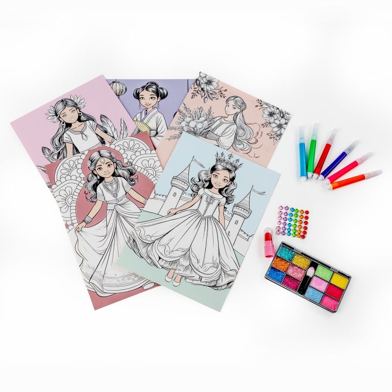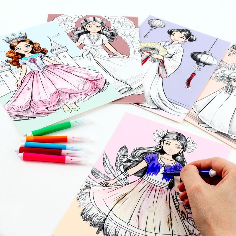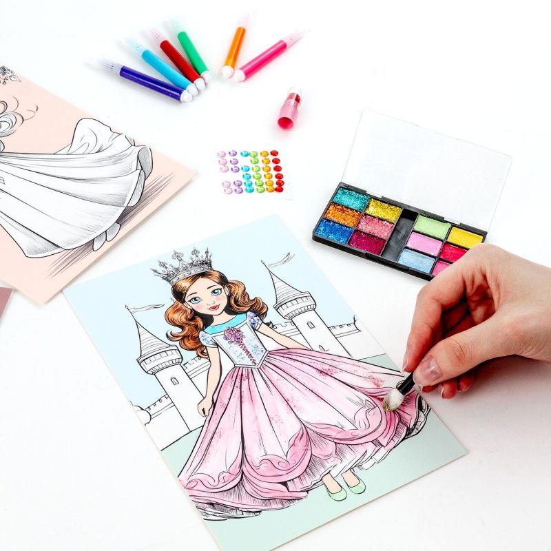 Дъски за оцветяване „Красота“. За малки художници, които искат да поемат ролята на истински моден дизайнер. Комплектът включва 5 дъски с принцеси в оригинални тоалети и рокли, 1 червило, 6 мини маркера, 36 диаманта и 12 сенки за очи. Благодарение на богатия набор от аксесоари, можете да създадете уникални визии за всеки герой - от романтични, флорални творения до елегантни вечерни тоалети.