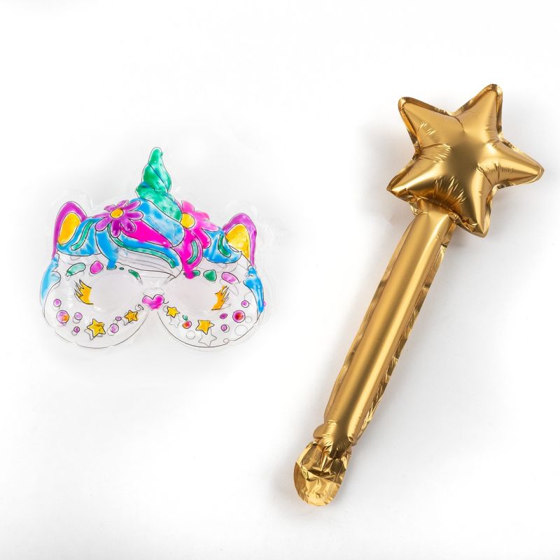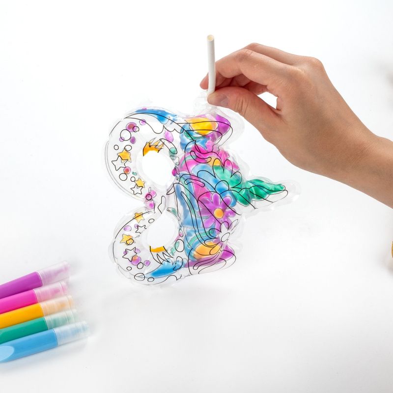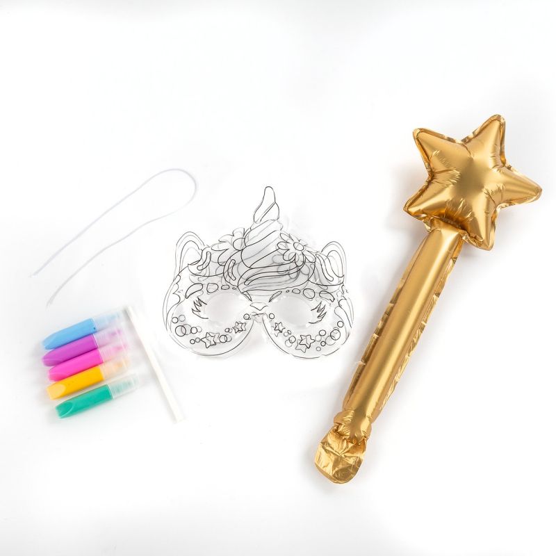 Комплект 3D маска с голяма пръчка с височина 36 см. Оцветете маската с избраните от вас цветове гел. Изчакайте гелът да изсъхне напълно – приблизително 5 часа. Поставете тръбичката в маската и я надуйте до желаната форма. Когато извадите тръбичката, клапанът се затваря автоматично, задържайки въздуха вътре. Надуйте пръчката по подобен начин.
