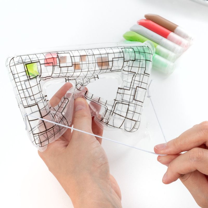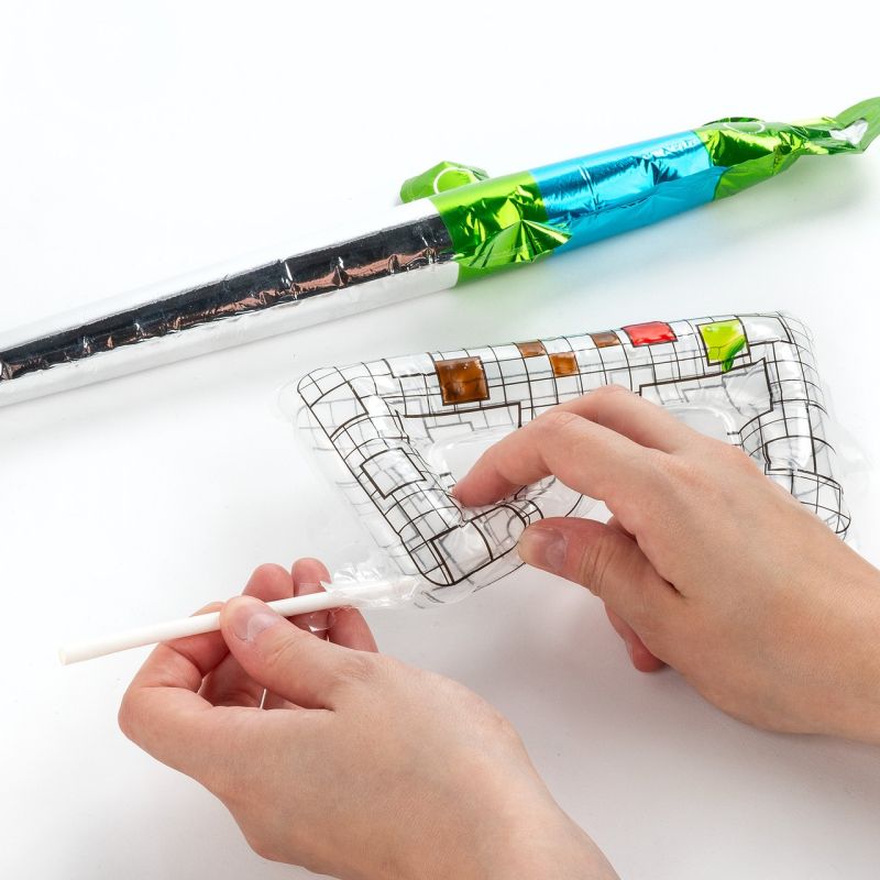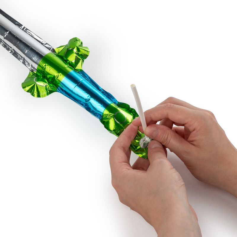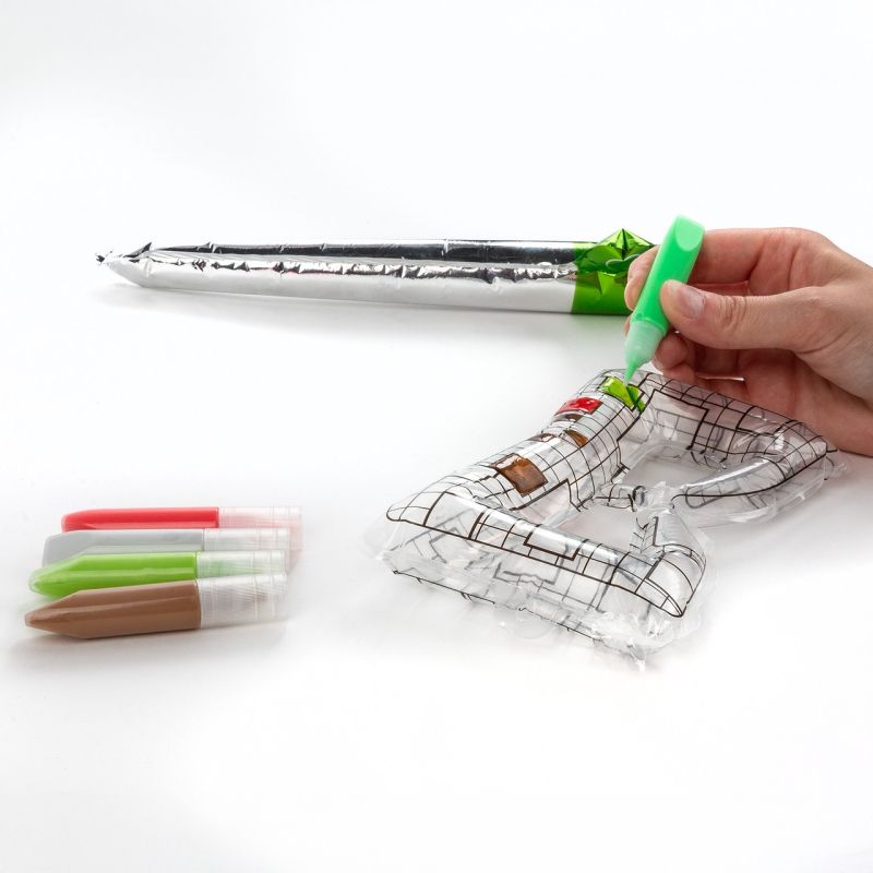 3D комплект с маска и голям меч, висок 36 см. Оцветете маската с избраните от вас цветове гел. Изчакайте гелът да изсъхне напълно – приблизително 5 часа. Поставете тръбичката в маската и я надуйте в желаната форма. Когато извадите тръбичката, клапанът автоматично се затваря, задържайки въздуха вътре. Надуйте меча по подобен начин.