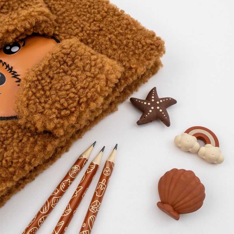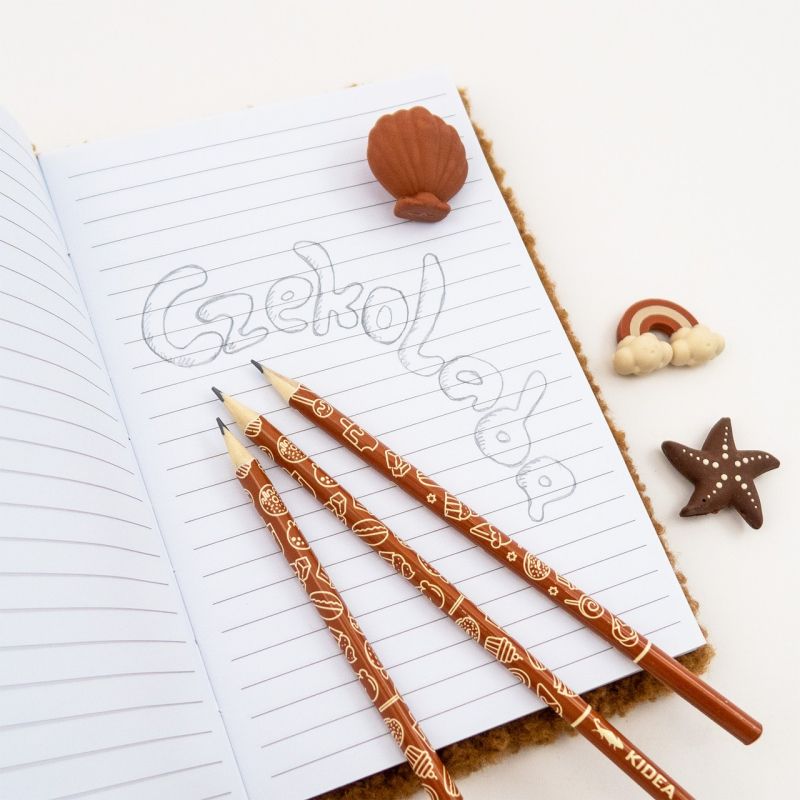 Ароматизиран незаменим артикул Kidea със сладък шоколадов аромат, този комплект включва три молива HB и три гумички във формата на мида, морска звезда и дъга. Средно твърдият графит и триъгълната форма правят тези моливи удобни и практични за употреба. Ароматните гумички не само изглеждат сладко, но и изтриват моливите прецизно. Те са идеални както за уроци по математика, така и за изобразително изкуство, а шоколадовият им аромат ще озари всеки ден, прекаран в училище.