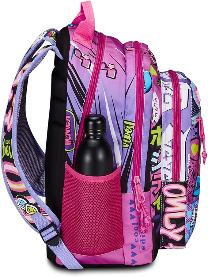 Висококачествена, ултра лека раница, изработена от водоустойчив материал. Разполага с 3 големи отделения и допълнителен джоб отпред за аксесоари. Гърбът и основата са подплатени с EVA, за да поддържат цялата тежест, дори когато детето бяга. Раменните презрамки са широки и меки в гъвкав пенопласт, а формата се адаптира към ширината на раменете. Раницата има два странични джоба от неопрен. Водоустойчив плат