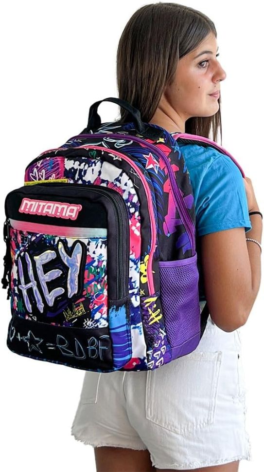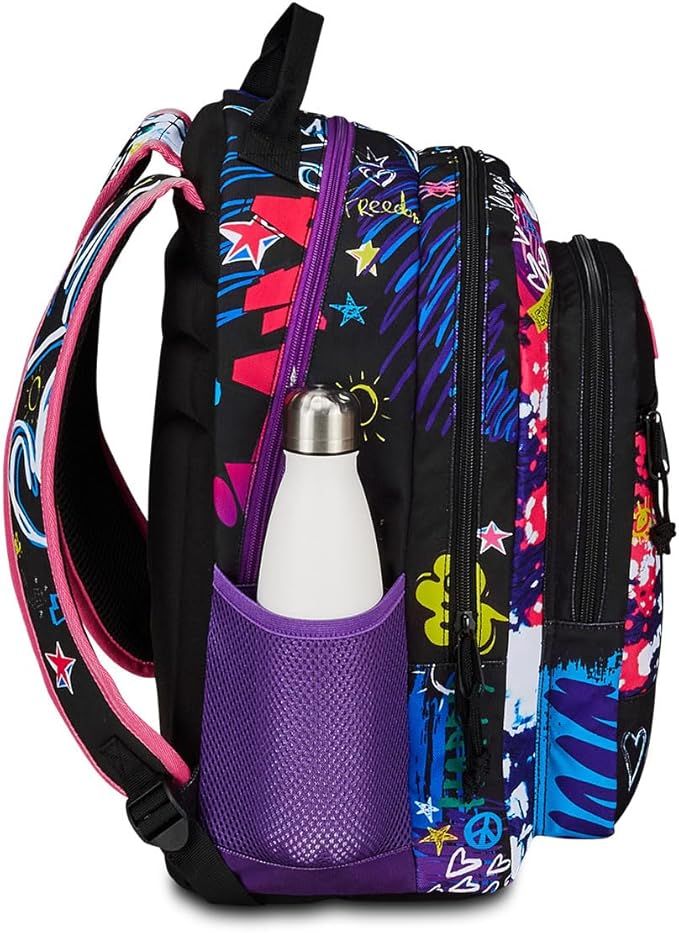 Висококачествена, ултра лека раница, изработена от водоустойчив материал. Разполага с 3 големи отделения и допълнителен джоб отпред за аксесоари. Гърбът и основата са подплатени с EVA, за да поддържат цялата тежест, дори когато детето бяга. Раменните презрамки са широки и меки в гъвкав пенопласт, а формата се адаптира към ширината на раменете. Раницата има два странични джоба от неопрен. Водоустойчив плат