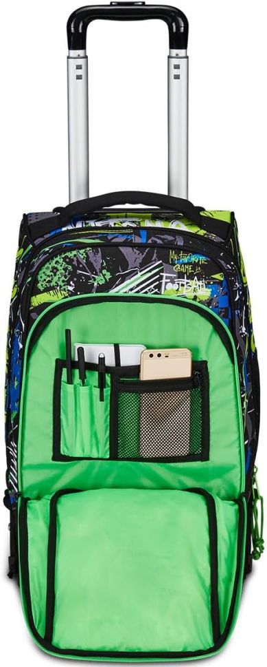Раница за училище или куфар за пътуване - изберете сами. Пастмасовото дъно и метална структура гарантират супер здравина. Благодарение на практичната кука за откачане на презрамките можете да решите как да носите раницата по предпочитания от вас начин, като я дърпате или на рамо. Огромното вътрешно отделение е просторно и добре организирано благодарение на отделенията, които ви позволяват да поддържате в ред дори най-малките вещи. Водоустойчивата материя осигурява допълнителна защита на раницата, докато подсилените шевове я правят лека, но много здрава.Easyfit дизайн