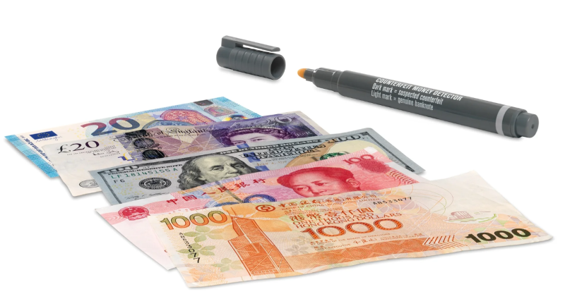 Маркер, с който може мигновено да се провери дали банкнотата е истинска. Идеално преносимо средство за проверка на фалшиви банкноти. Маркерът е перфектен начин за проверка на всички валути бързо и лесно, на всяко място. Когато поставеният знак е тъмен, банкнотата е фалшива. Ако знакът избледнее и накрая изчезне-банкнотата е истинска. Може да се използва за тестване на всички видове банкноти и валути. Характеристики: • Мигновена проверка • Подходяща за всички видове банкноти и валути