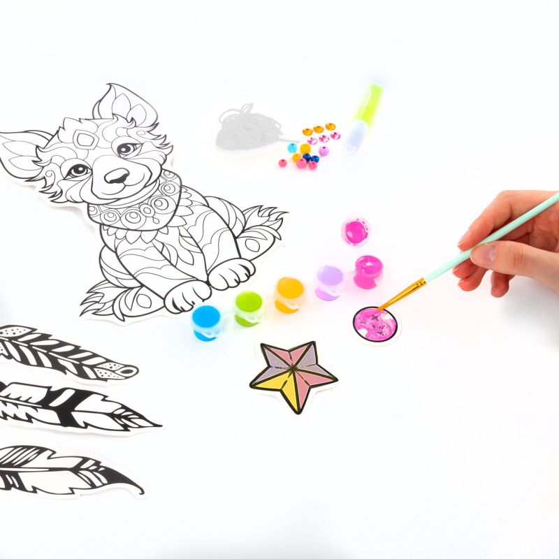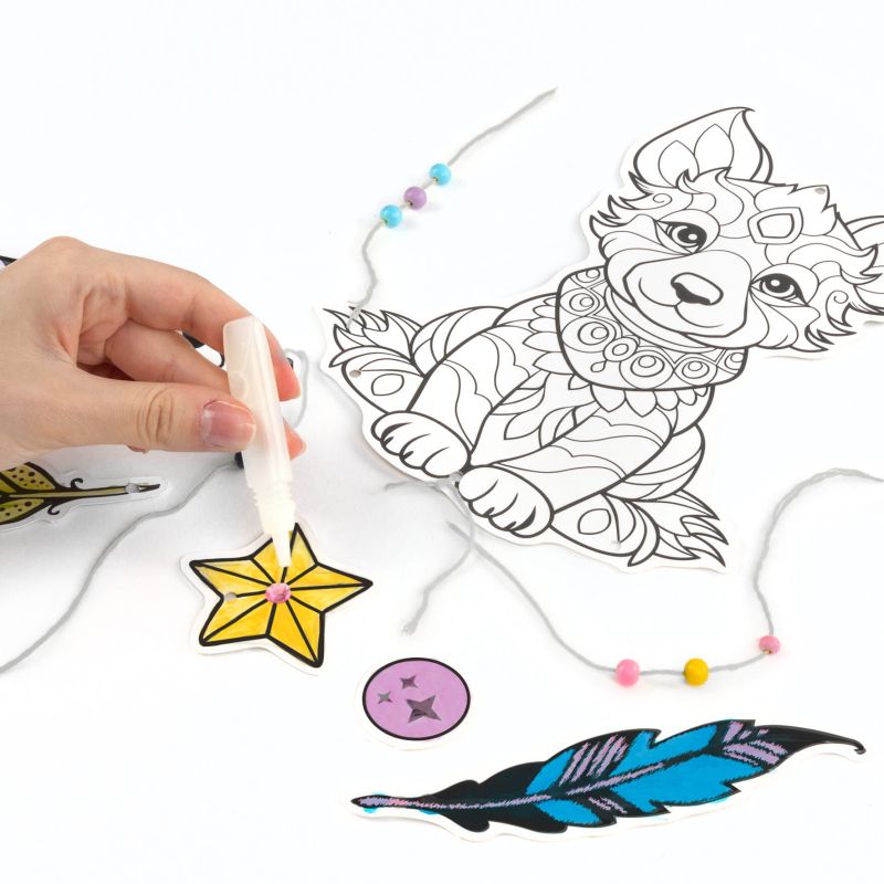 Ловец на сънища, светещ в тъмното. Проектирайте своя магически ловец с картонен шаблон на мистично животно, заобиколено от пера и звезди, което ще украси красиво стаята и ще я освети вечер. Опаковката съдържа 9 мъниста, 6 диаманта, 6 картонени форми, 5 цвята бои и четка, светещо лепило и връв за свързване на всички елементи. Това е чудесен начин да прекарате време творчески и да получите красива декорация.